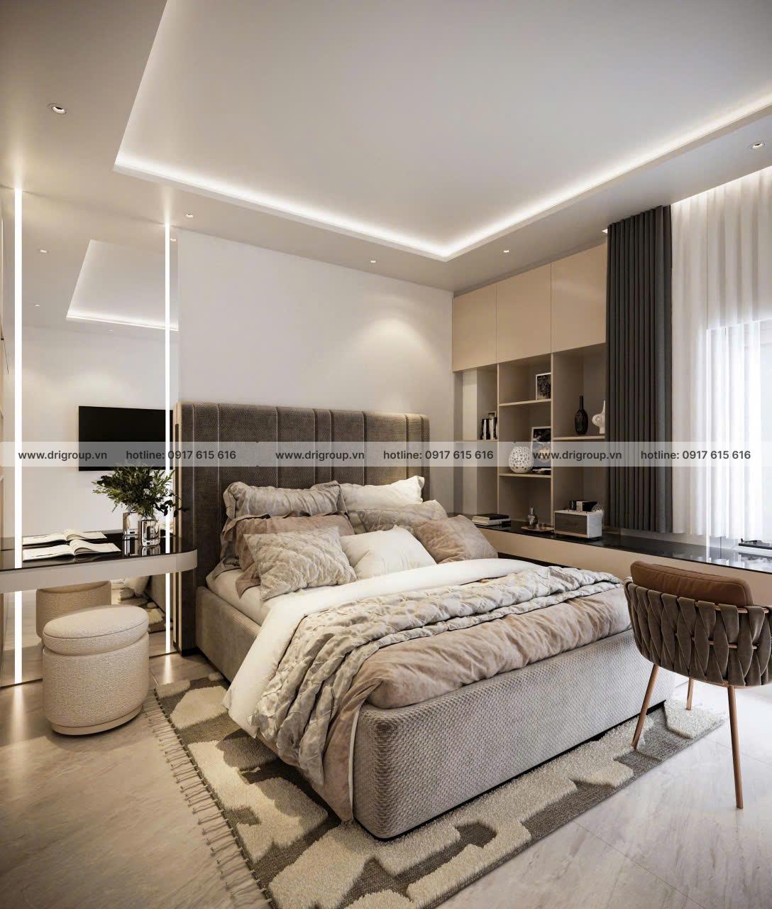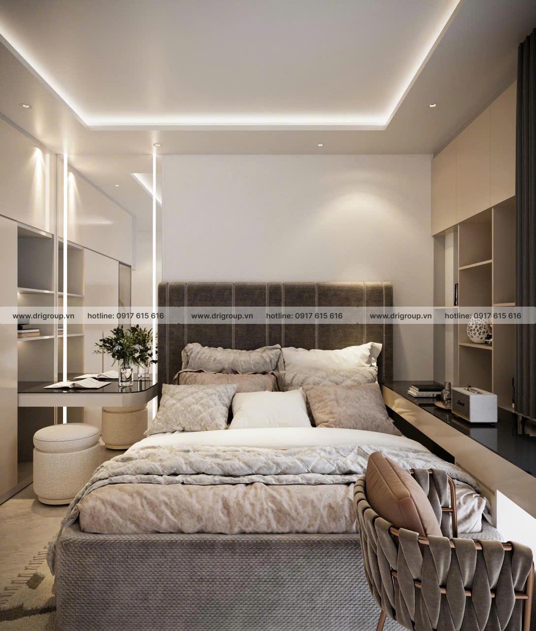 Phòng ngủ sử dụng chất liệu nỉ và gỗ trung tính, kết hợp ánh sáng gián tiếp chạy viền trần tạo hiệu ứng mềm mại.