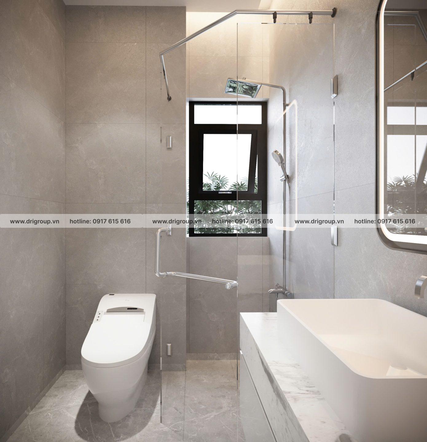 Phòng tắm sử dụng gạch đá vân xám toàn bộ không gian, mang lại cảm giác sạch sẽ và cao cấp.