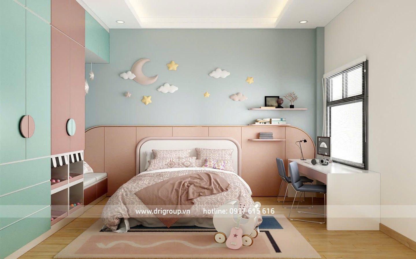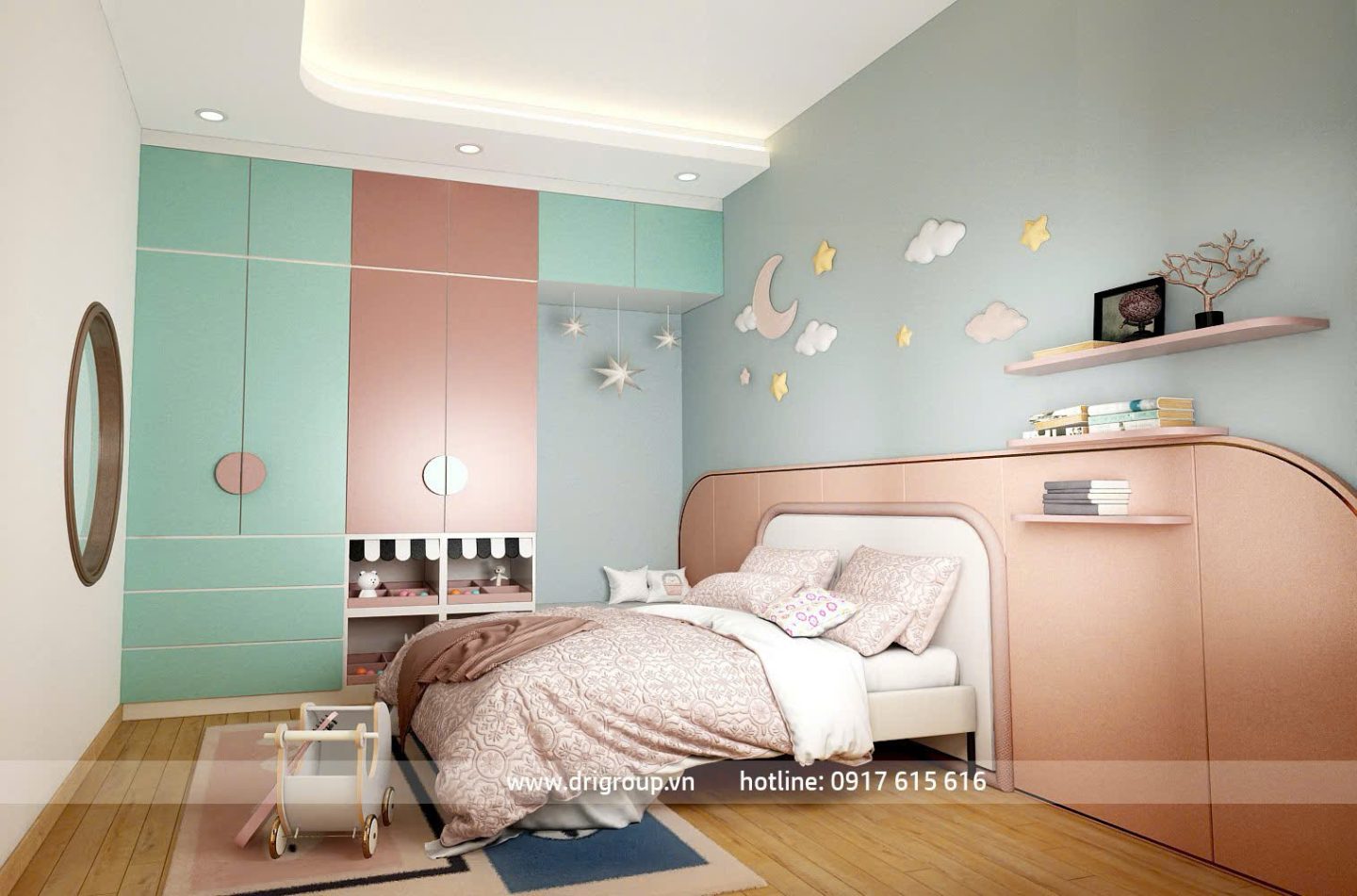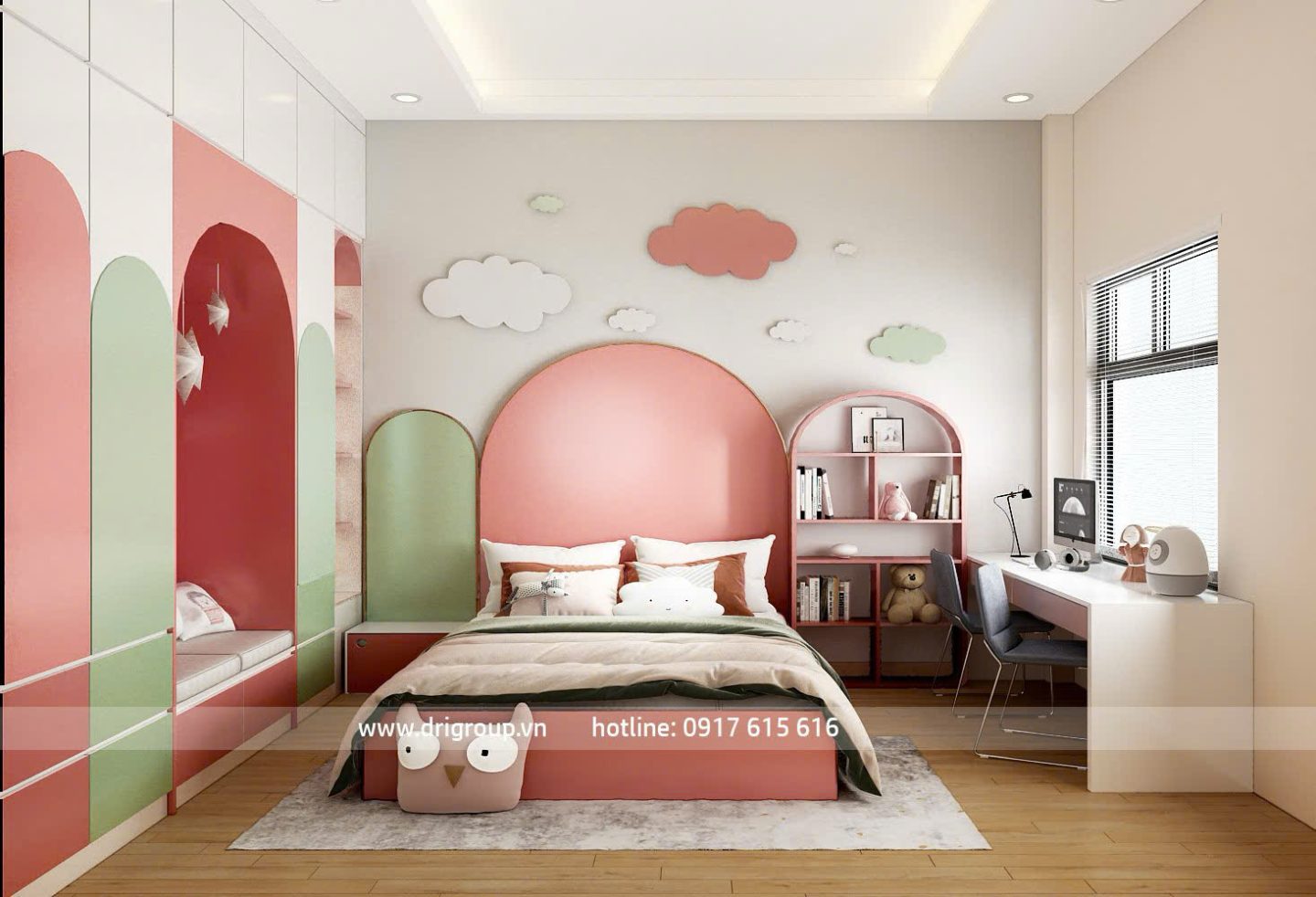 Phòng trẻ em là điểm nhấn nổi bật với gam màu hồng – pastel – xanh mint nhẹ nhàng, tạo cảm giác vui tươi và sáng tạo. Các chi tiết mây trời, vòm cong, kệ sách bo tròn giúp không gian trở nên an toàn, mềm mại và đầy cảm hứng cho bé.