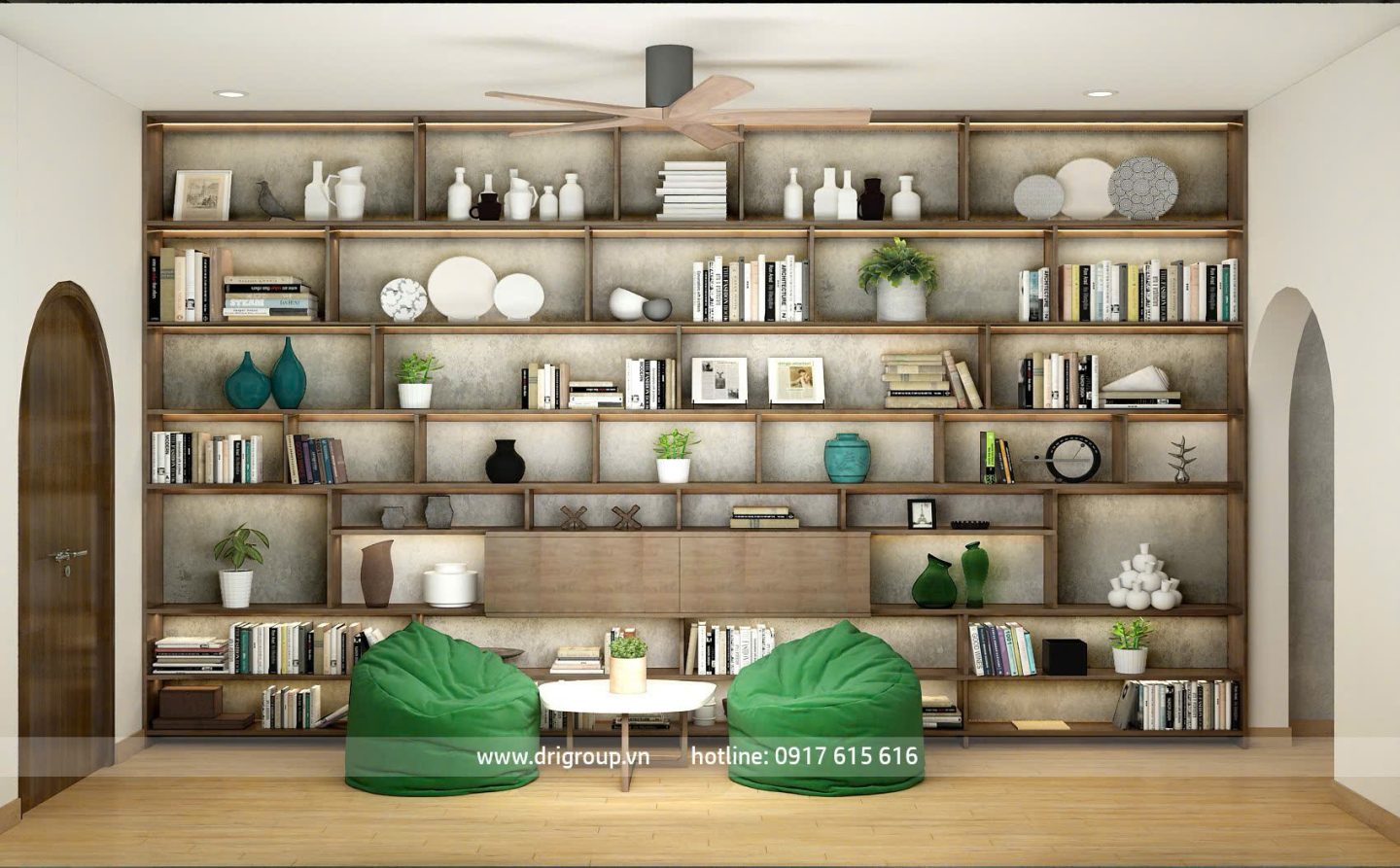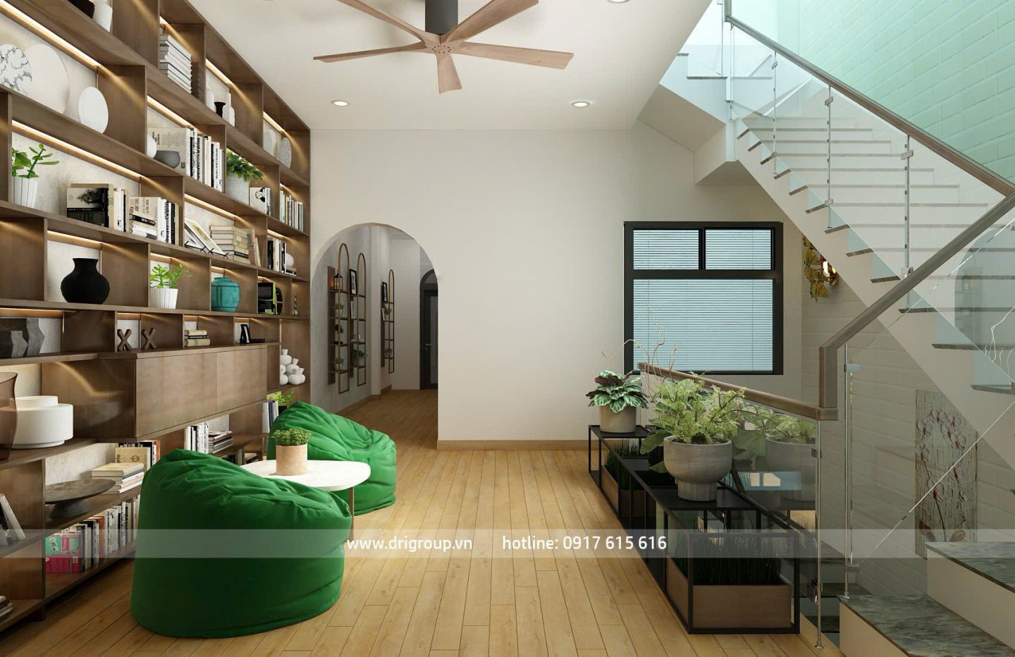 Khu vực sinh hoạt chung gây ấn tượng mạnh với kệ sách lớn chạy dọc tường, thiết kế mở kết hợp ghế lười xanh và hệ lam gỗ – một góc đọc sách và thư giãn hoàn hảo cho cả gia đình. Cầu thang kính hiện đại kết hợp mảng xanh trong nhà mang lại sự thông thoáng và gần gũi thiên nhiên.