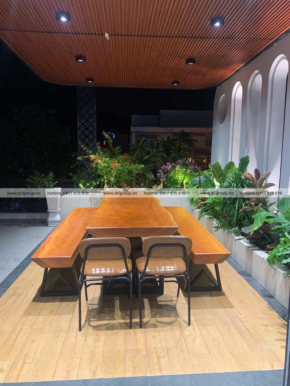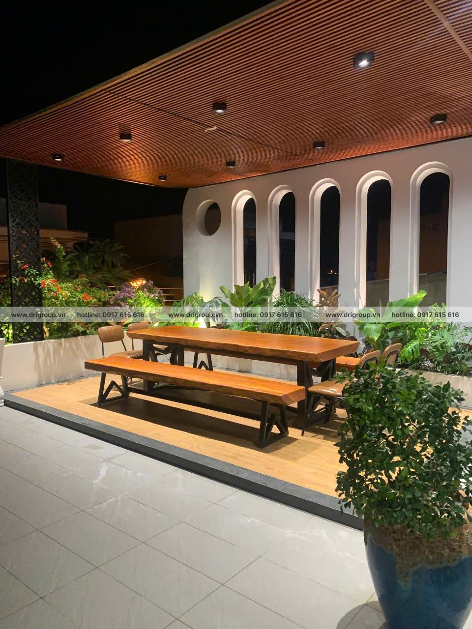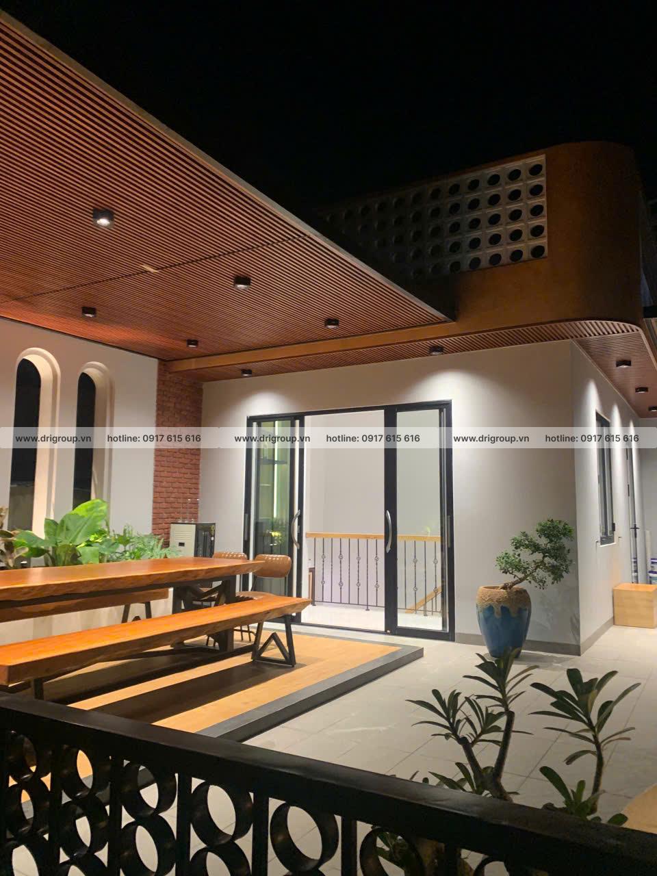 Sân thượng là điểm nhấn nổi bật của căn nhà với khu dining ngoài trời, thiết kế mái gỗ lam hiện đại, ánh sáng vàng ấm và hệ cây xanh bao quanh. Đây là không gian lý tưởng để gia đình tổ chức tiệc tối, sum họp bạn bè hoặc đơn giản là thư giãn, tận hưởng khí trời mát mẻ của Nha Trang.