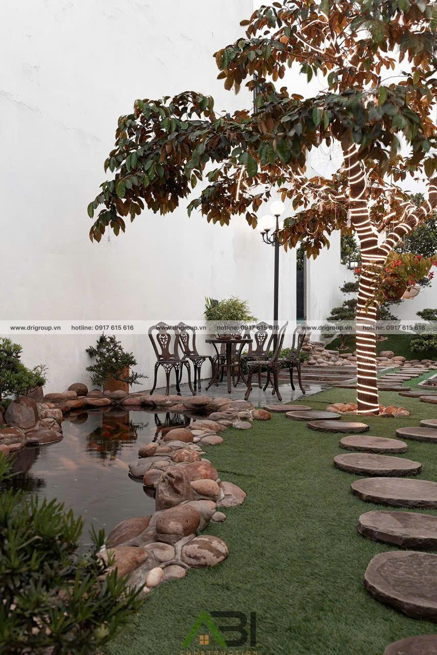 Khu vườn – hồ cá – lối đi đá – không gian nghỉ dưỡng ngay trong nhà