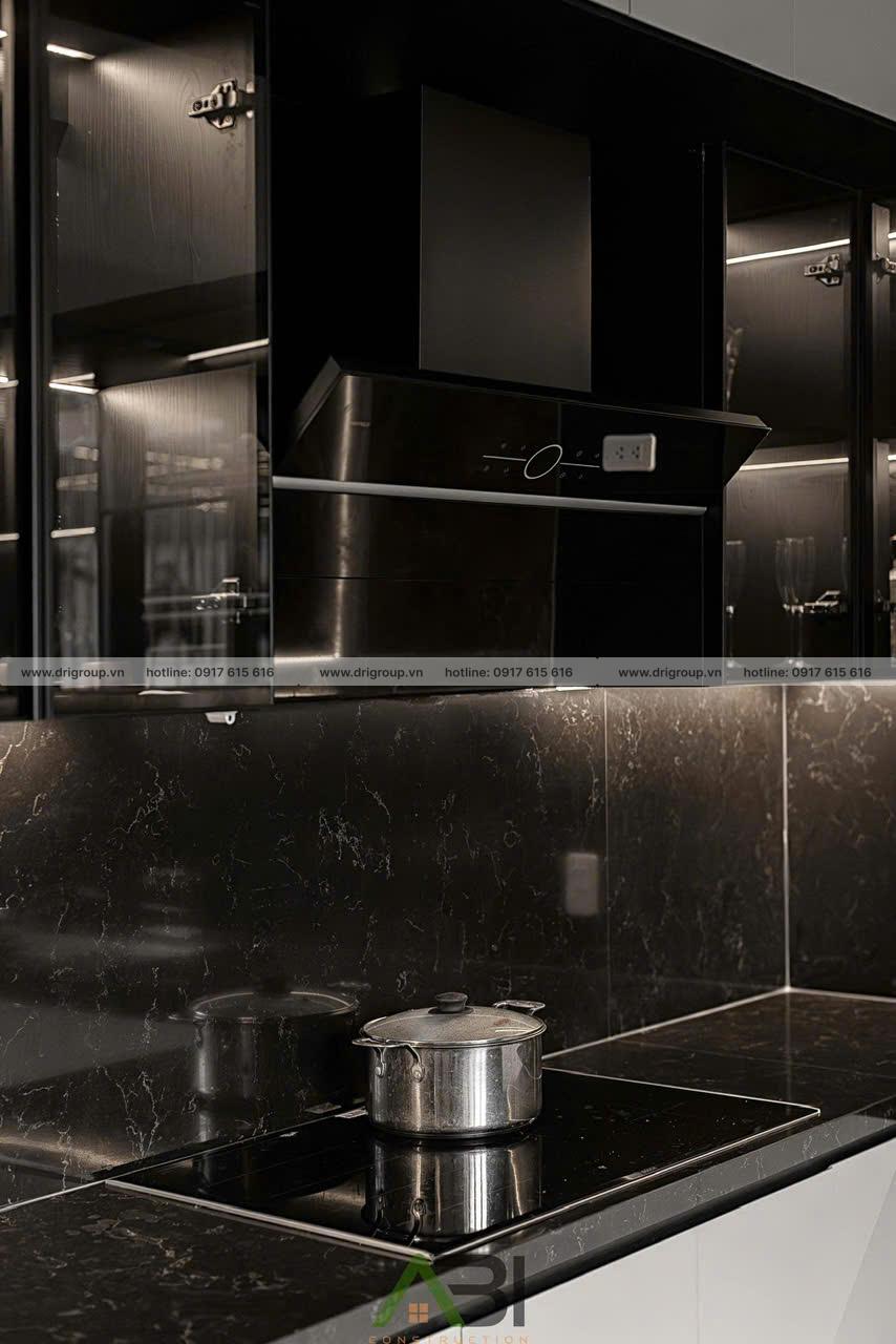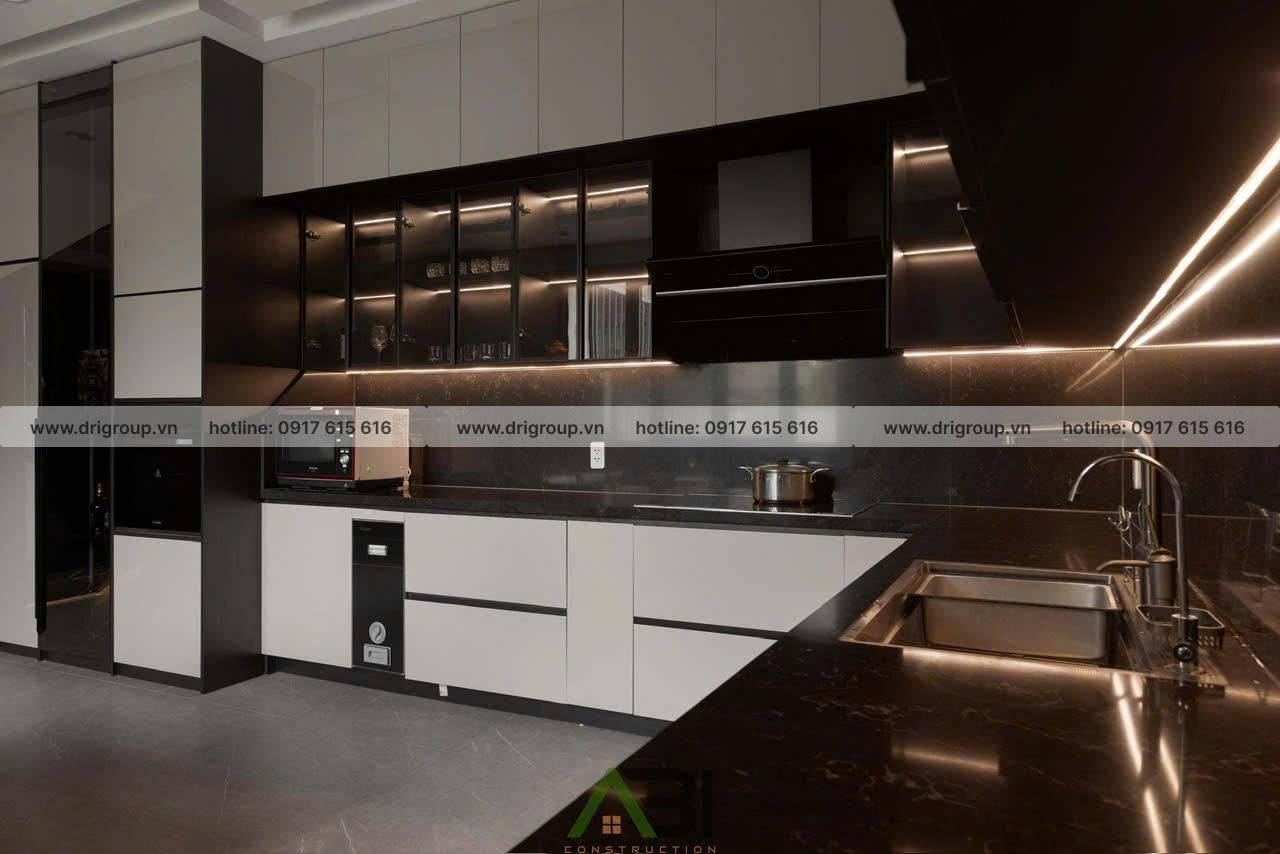 Khu bếp được thiết kế theo dạng L + đảo bếp, tối ưu không gian sử dụng. Tông màu trắng – đen cùng vật liệu acrylic và đá marble giúp khu vực trở nên hiện đại, sạch sẽ và sang trọng.