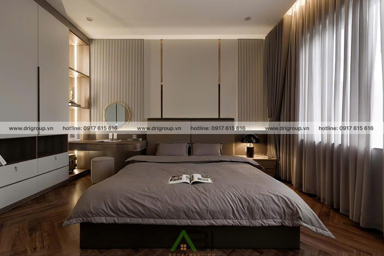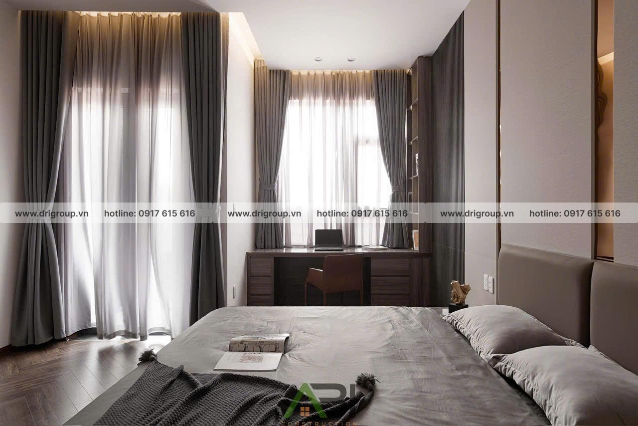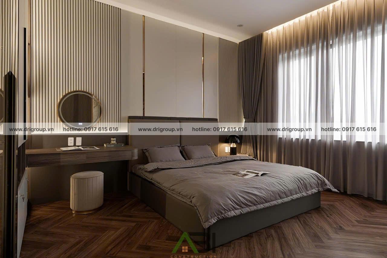 Phòng ngủ sử dụng sàn gỗ nâu sang trọng, kết hợp tường ốp lam gỗ và hệ rèm hai lớp để tạo cảm giác ấm áp, yên bình.